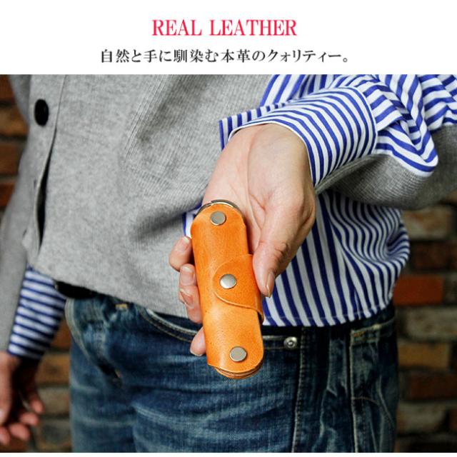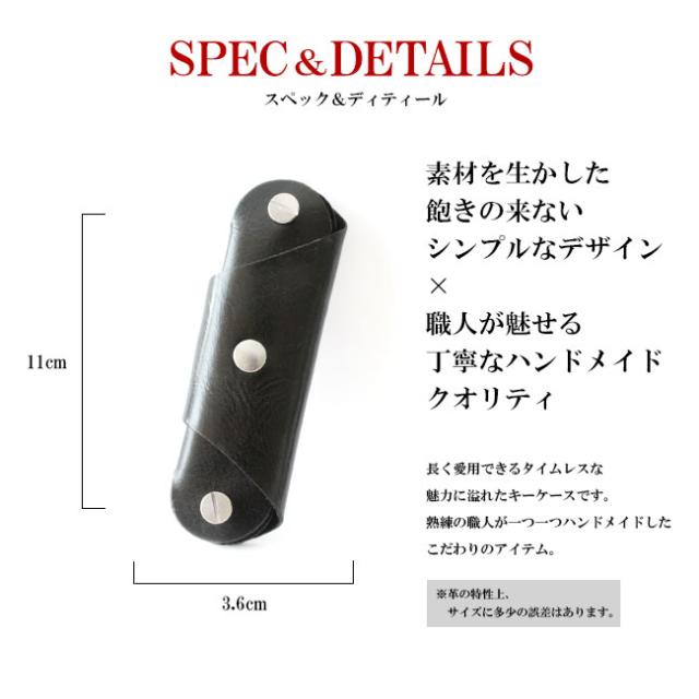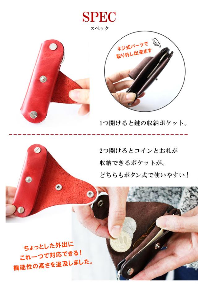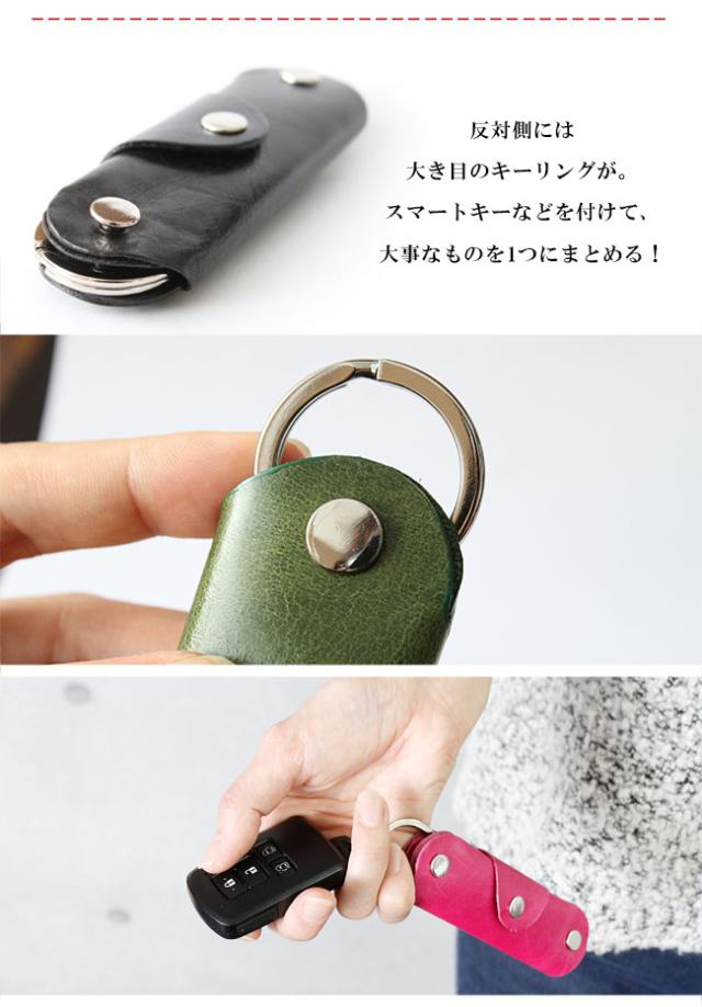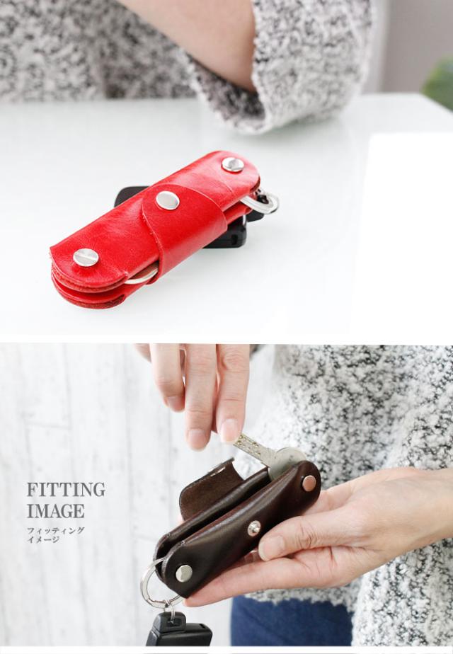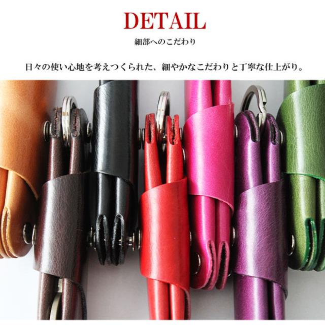 イタリアンプルアップオイルレザーを使用した本革仕様のキーケースです。滑らかな手触りと上品な艶が美しく、渋みのあって鮮やかな7色のカラーバリエーションからお選びいただけます。縦長のスマートなデザインになっており、中には2つのポケットがあるので小銭やお札を折って収納することができます。上下の留め具はネジ式になっており、キーリングの付け外しができるようになっています。