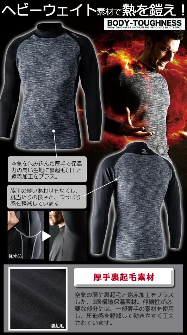| BODY TOUGHNESS(ボディタフネス)の厚地タイプのホットコンプレッションです。 ただの厚地ではなく保温力を高めるエアサンド多層構造に裏起毛と遠赤加工をプラスしたトリプル保温が自慢です。 首、脇、腕の内側部分には、伸縮性に優れた薄地の微細裏起毛ファブリックを使用していますので、高い保温性能を保ちつつ、腕や胴体部分の圧迫感を解消し動きやすくなっています。 首まわりと脇部分には消臭コアーミシン糸スイトールCを使用しており、気になる臭いもスピード消臭してくれます。 しっかりしたストレッチと、脇部分の縫製を無くしたトリカット縫製により、腕を上げたときのつっぱりが軽減されていています。 冬のワークシーンを暖かく快適な着心地でサポートしてくれます。 | ||||||
