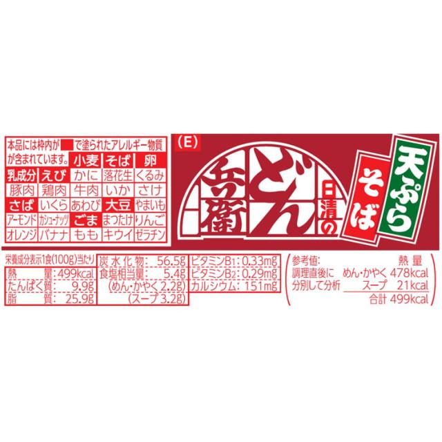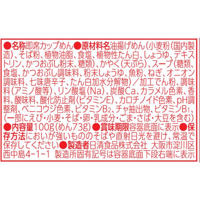 | 油揚げめん(小麦粉(国内製造)、そば粉、植物油脂、食塩、植物性たん白、しょうゆ、デキストリン、かつおぶし粉末、糖類)、かやく(天ぷら)、スープ(糖類、食塩、かつおぶし調味料、粉末しょうゆ、魚粉、ねぎ、オニオン調味料、七味唐辛子、たん白加水分解物)/加工でん粉、調味料(アミノ酸等)、リン酸塩(Na)、炭酸Ca、カラメル色素、香料、酸味料、酸化防止剤(ビタミンE)、カロチノイド色素、pH調整剤、ベニコウジ色素、ビタミンB2、チャ抽出物、ビタミンB1、(一部にえび・小麦・そば・卵・乳成分・ごま・さば・大豆を含む) |
