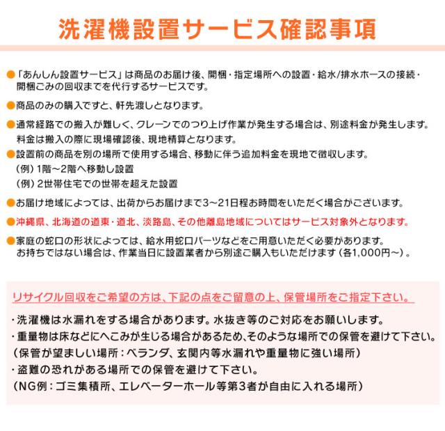 ※こちらの設置サービスは、商品のお届け後、開梱・指定場所への設置・上下ホースの取付・開梱ごみの回収までを代行するサービスです。
