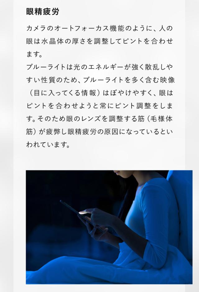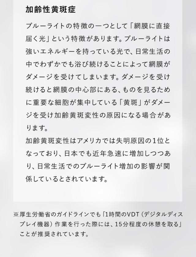 | ●商品ポイント | 瞳を守る新常識。あなたの瞳をブルーライトから守ります。PC・スマホ・TVから発せられる日常生活で浴びるブルーライトをカット。 一日どれくらいブルーライトを浴びているか知っていますか? 私たちが1日のうち、ブルーライトを発するデジタル機器に接触する平均時間は約6時間(2020年度)程度といわれています。スマートフォンやパソコン、タブレットやテレビなどブルーライトを発するデバイスが日常生活品となり、14年間で約117分も増加しているとされています。 ブルーライトは有害? ブルーライトは人の目に見える光(可視光線)の中で、約380〜500nmの波長を持った青色光のことです。「人工的な光」というイメージがあるかもしれないですが、自然界にある光の一部であり可視光線の中でも、もっとも波長が短く強いエネルギーを持っています。ブルーライトの特徴として散乱率が高く、角膜や水晶体で吸収されずに網膜まで到達する、紫外線に近い光と言われています。 眼疲労 カメラのオートフォーカス機能のように、人の眼は水晶体の厚さを調整してピントを合わせています。ブルーライトは光のエネルギーが強く散乱しやすい性質のためブルーライトを多く含む映像(目に入ってくる情報)はぼやけやすく、眼はピントを合わせようと常にピント調整をします。そのため眼のレンズを調整する筋(毛様体金)が疲弊し眼精疲労の原因になっているといわれています。 肥満と生活習慣病 良質な睡眠には睡眠ホルモンといわれている「メラトニン」の分泌が必要不可欠となりますが、ブルーライトはこのメラトニンの分泌を抑制する可能性があるといわれています。ブルーライトは太陽光にも含まれる光で、長時間浴びていると脳が昼間であると勘違いを起こし、体内時計にずれが生じスムーズな就寝ができない可能性があります。体内時計の睡眠と覚醒のリズムが乱れることで、メラトニンの分泌が減ると肥満や生活習慣病、さらには癌などの発症に影響しかねません。 加齢性黄斑症 ブルーライトの特徴の一つとして「網膜に直接届く光」という特徴があります。ブルーライトは強いエネルギーを持っている光で、日常生活の中でもわずかでも浴び続けることによって網膜がダメージを受けてしまいます。ダメージを受け続けると網膜の中心部にある、ものを見るために重要な細胞が集中している「黄斑」がダメージを受け加齢黄斑変性の原因になる場合があります。加齢性黄斑変性はアメリカでは失明原因の1位となっており、日本でも近年急速に増加しつつあり、日常生活でのブルーライト増加の影響が関係しているとされています。 レンズ全体の黄色の色素がブルーライトを軽減してくれます。また、裸眼の色を変えるカラーコンタクトとは違い、違和感のない自然な瞳になるように設計されています。 |