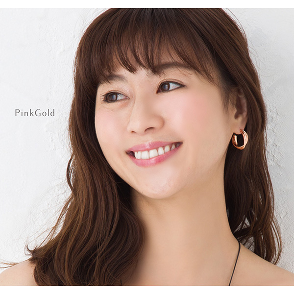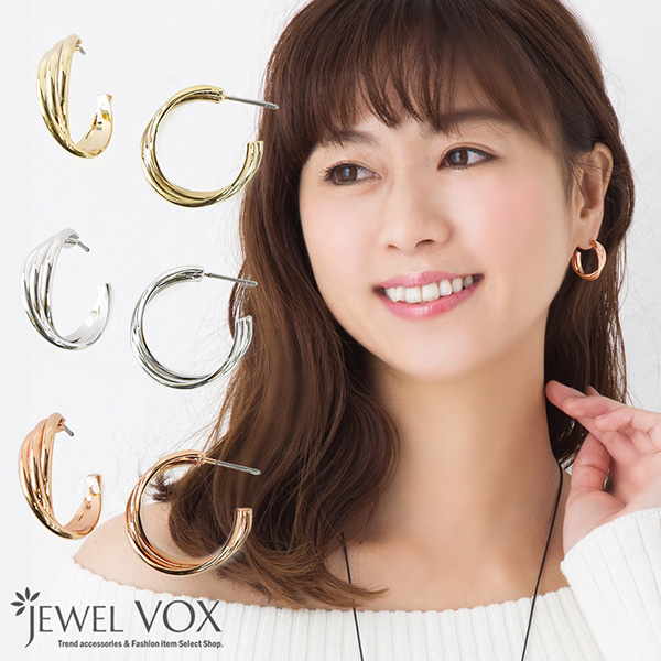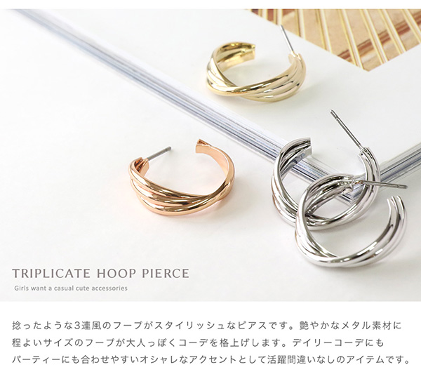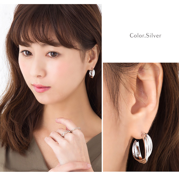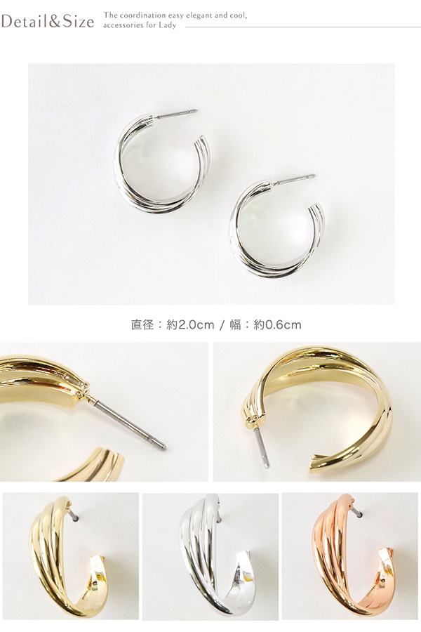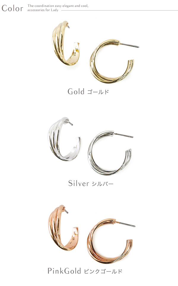 | 捻ったような3連風のフープがスタイリッシュなピアスです。艶やかなメタル素材に 程よいサイズのフープが大人っぽくコーデを格上げします。デイリーコーデにも パーティーにも合わせやすいオシャレなアクセントとして活躍間違いなしのアイテムです。 | |