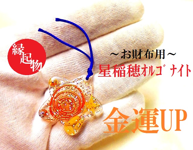 稲穂星は運気UPのお手伝いをしてくれるオルゴナイト仕上げとなっており、中に金運UPのルチルクォーツ、金銀財宝の金銀の玉、ラッキーを呼び込むラッキー星、お金にまつわる邪気祓いをしてくれるラメが入っております。