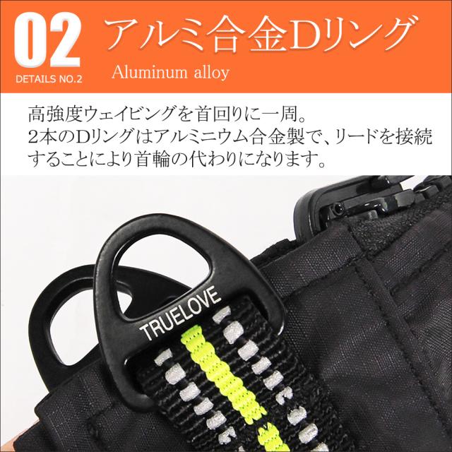首回りに一周する高強度のウェイビングと2本のDリングにリードを取り付けていただくことが可能。