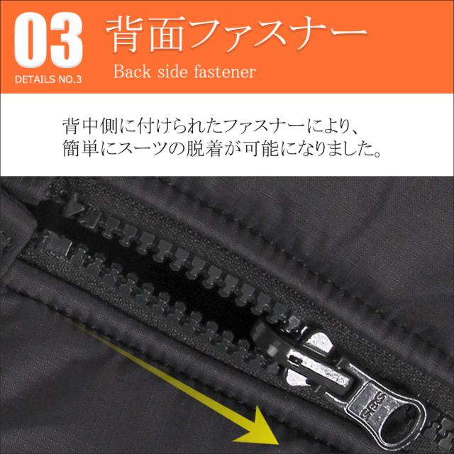 足を通して背中のジッパーを上げるだけの簡単設計。