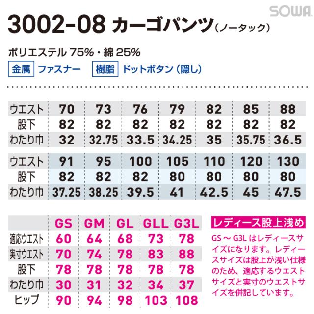 3002-08 SOWA ノータックカーゴパンツ ポリエステルで本物のストレッチを実現! JIS T8118 規格適合 レディースサイズ対応