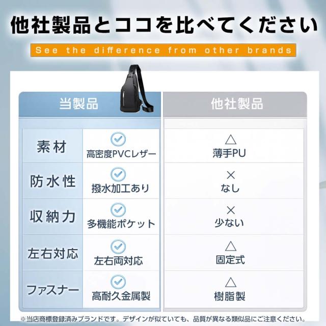 カラー:ブラック、ブラックグレー 仕様:ワンショルダー(ボディバッグタイプ) セット:バッグ本体, USBケーブル(Type-A) 素材:PVCレザー 寸法:幅15cm×奥行6cm×31cm 用途:通勤・通学・旅行・アウトドア・街歩き |