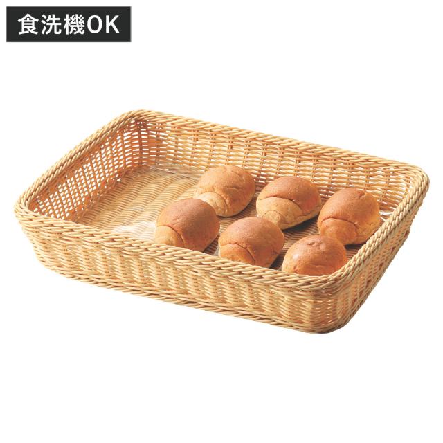 籐のような手編みのぬくもりを感じるPP製バスケットです。パンやお菓子などの陳列や、耐熱温度は120度なので、焼き立てのパンの保管におすすめです。食材以外にも、タオルを収納したり、ペーパー類の一時置きや小物の整理など様々な用途でお使いいただけます。