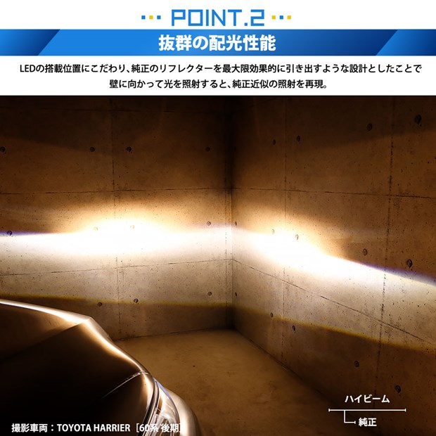 リフレクター性能を最大限効果的に引き出すような設計で純正球の発光位置と同じ位置、灯体の中心にLEDを実装。純正ハロゲンバルブ近似のカットラインを再現しています。