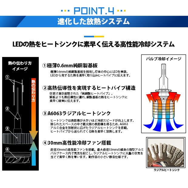 直径30mmの高性能ファンを搭載。最大直径33mmの細身の筒型アルミバルブケース内で気流を起こし、ヒートシンクに大量の空気を当てて素早く熱を奪います。