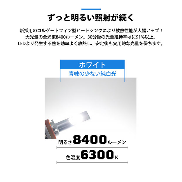 新採用のコルゲートフィン型ヒートシンクにより放熱性能が大幅アップ! 光量の全光束8400ルーメン。30分後の光量維持率は91%以上。LEDより発生する熱を効率よく放熱し、安定後も実用的な光量を保ちます。 リフレクター性能を最大限効果的に引き出すような設計で純正球の発光位置と同じ位置、灯体の中心にLEDを実装。純正ハロゲンバルブ近似のカットラインを再現しています。 純正ハロゲンバルブを遥かに上回る明るさと、より遠くを照射する拡散性は圧巻です。視認性の高さを確実に実感していただけます。 | ||||