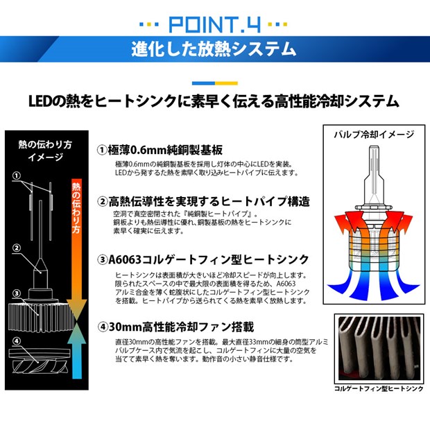 新採用のコルゲートフィン型ヒートシンクにより放熱性能が大幅アップ! LEDで発生した熱を効率よく放熱します。 1)純銅製基板 LEDを実装した極薄純銅製基板。LEDで発生した熱を素早く取り込みヒートパイプに伝えます。 2)純銅製ヒートパイプ 空洞で真空密閉されたヒートパイプ。銅板よりも熱伝導性に優れ、銅製基板の熱をヒートシンクに素早く確実に伝えます。 3)コルゲートフィン型ヒートシンク ヒートシンクは表面積が大きいほど冷却スピードが向上します。限られたスペースの中で最大限の表面積を得るため、A6063アルミ合金を薄く蛇腹状にしたコルゲートフィン型ヒートシンクを搭載。ヒートパイプから送られてくる熱を素早く放熱します。 4)高性能ファン 直径30mmの高性能ファンを搭載。最大直径33mmの細身の筒型アルミバルブケース内で気流を起こし、コルゲートフィンに大量の空気を当てて素早く熱を奪います。 | |||