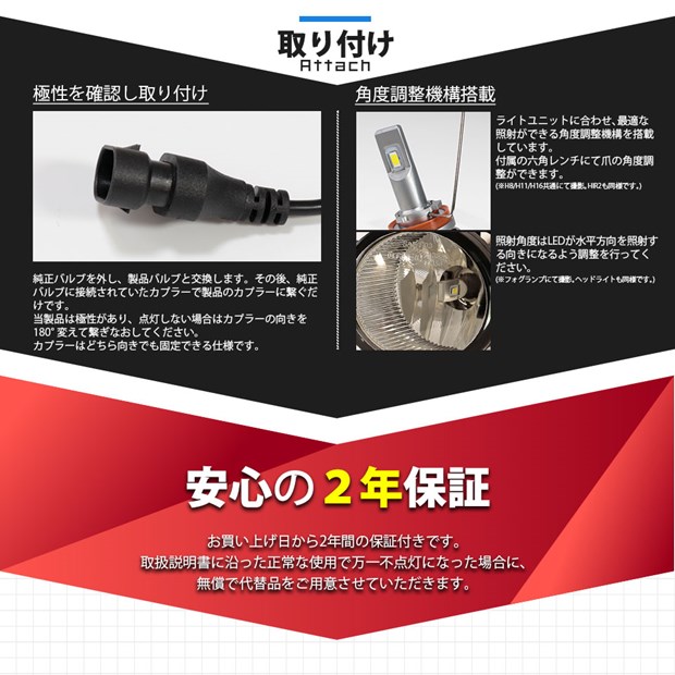 LEDバルブ本体 2個 結束バンド 2本 六角レンチ 1本 取扱説明書 1部 | |||