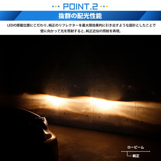 リフレクター性能を最大限効果的に引き出すような設計で純正球の発光位置と同じ位置、灯体の中心にLEDを実装。純正ハロゲンバルブ近似のカットラインを再現しています。