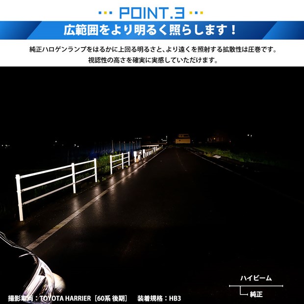 純正ハロゲンバルブを遥かに上回る明るさと、より遠くを照射する拡散性は圧巻です。視認性の高さを確実に実感していただけます。
