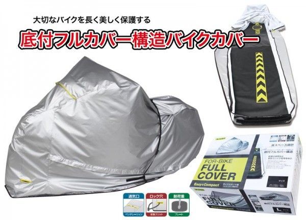 バイクをまるごと覆うタイプのバイクカバーですので、長期保管時に活躍します。カバー下からの冷気や湿気をシャットアウトし、ホコリ、雨の進入を防ぎます。また、猫などの小動物や昆虫類(蜘蛛やカメムシ)等の虫の侵入も防止します。カバー底面は耐久性に強いターポリンを使用し、ベンチレーションや前後のロック穴も設けています。使用しない時は小さく折りたたみができますので収納にも困りません。