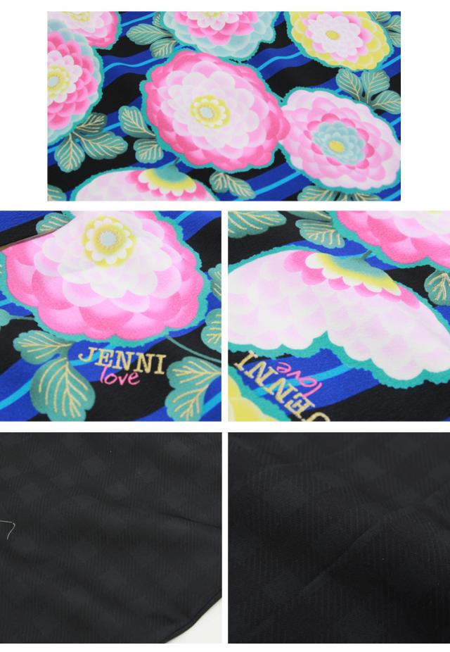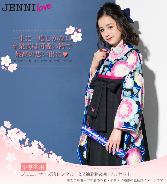 【7泊8日レンタル】レンタル JENNI love 卒業式 袴 小学生 女の子 小学校「ジュニア卒業式袴レンタルセット 青・黒の縞地にピンク丸菊」 レトロ