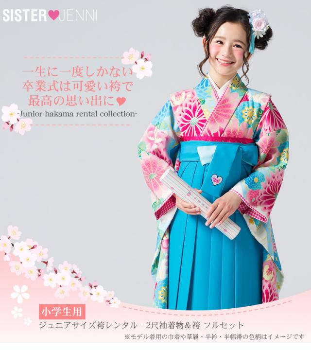 【7泊8日レンタル】レンタル SISTER JENNI 卒業式 袴 小学生 女の子 小学校「ジュニア卒業式袴レンタルセット クリーム地にピンク・水色の牡丹と菊」 レトロ