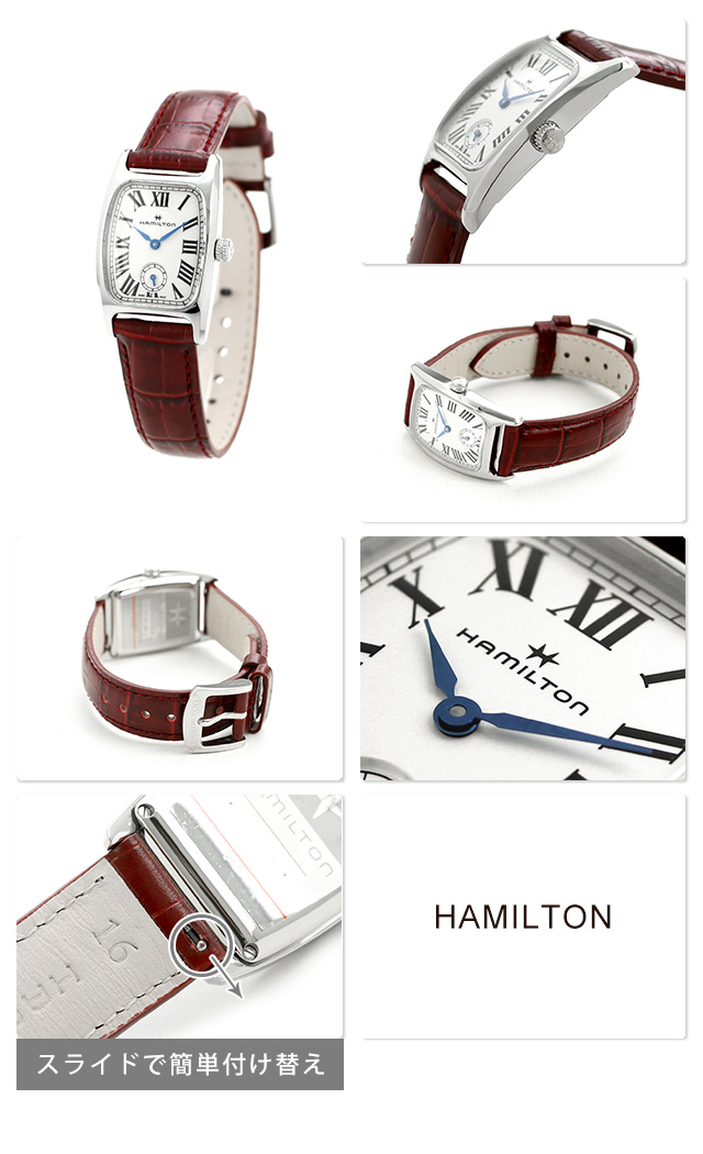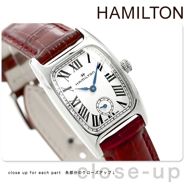 3年保証キャンペーン ハミルトン アメリカン クラシック ボルトン 24mm ペアウォッチ スモールセコンド スイス製 クオーツ レディース 腕時計 H13321811 HAMILTON AMERICAN CLASSIC BOULTON アナログ シルバー×レッド 革ベルト ◆HAMILTON(ハミルトン)はアメリカ発祥の老舗ブランドです。創業翌年に誕生した懐中時計「ブロードウェイ・リミテッド」は、他の時計よりも正確に時を刻むことから鉄道用時計として採用されました。その後も航空用時計や軍用時計として採用されるなど、品質の高さと流行にながされない独自のデザインが世界中の人々に支持されています。 アール・デコとアメリカンクラシックスタイルが融合したハミルトンの新しい「ボルトン」。独特なフォルムのケースを携えた「ボルトン」は、1940年に登場して以来、愛され続けています。今までのボルトンシリーズには無かったブラックラッカー仕上げのインデックスは、1940年代のアメリカンスタイルを妄想させてくれます。クラシックで上品なデザインはシーンを問わずお使いいただけます。2サイズ展開。ペアウォッチとしてもおすすめです。