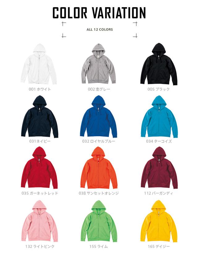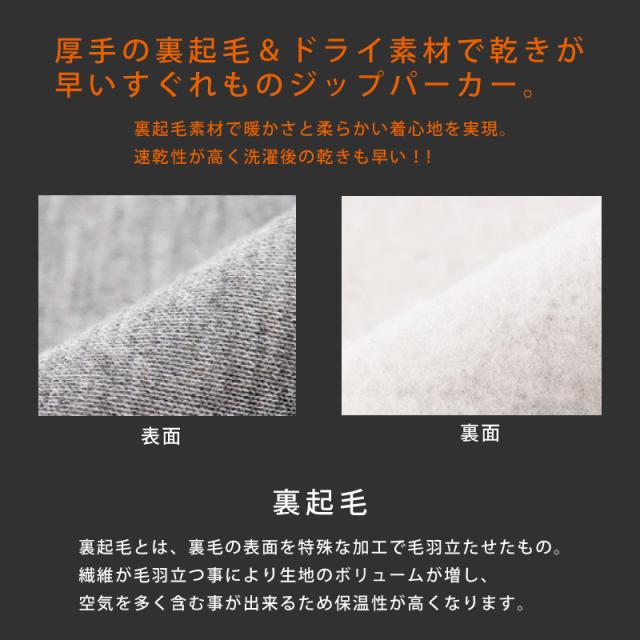 厚手の裏起毛&ドライ素材で乾きが早いすぐれものジップパーカー。カラフルなドライスウェットが登場。裏起毛素材で暖かさと柔らかい着心地を実現しました。速乾性が高く洗濯後の乾きも早いため、秋冬にオススメです。この着心地の良さを是非体感してください。