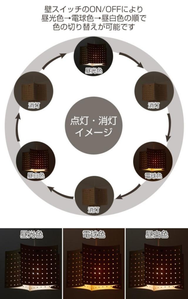 壁スイッチのON/OFF操作で、昼光色・電球色・昼白色の3色に順番に切り替えが可能です。作業中などは昼光色、落ち着いた雰囲気には電球色、普段使いには昼白色など、お部屋の雰囲気や好みに合わせてお使いください。
