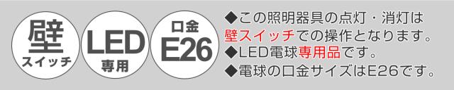 | 備考 | ・定格電圧:AC100V ・消費電力:9W ・口金:E26 ・全光束:800lm ・LED電球付き(3色切替):昼光色/6500K、電球色/3000K、昼白色/4000K ※市販のLED電球を取り付けた場合、ON/OFFの切り替えになります。 |