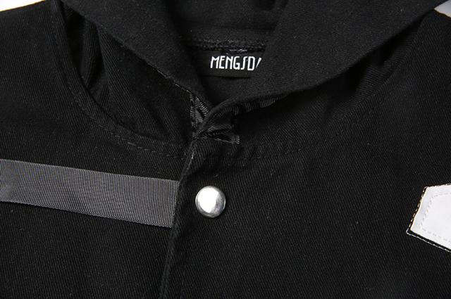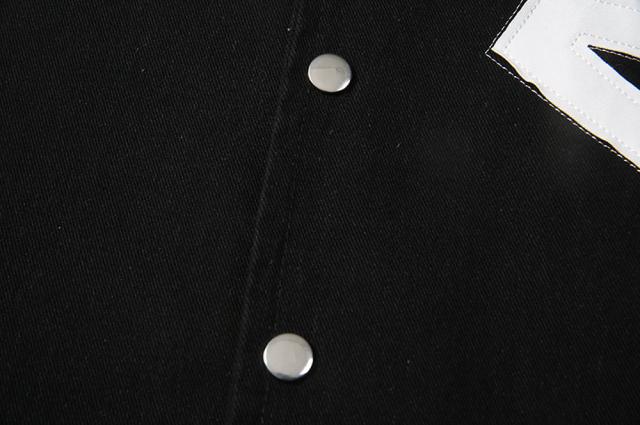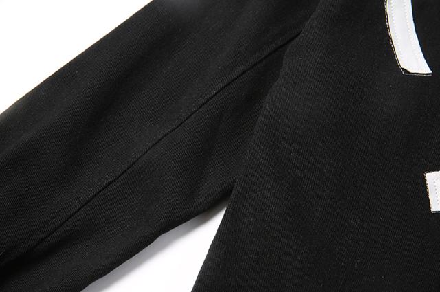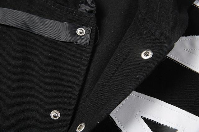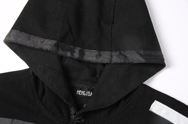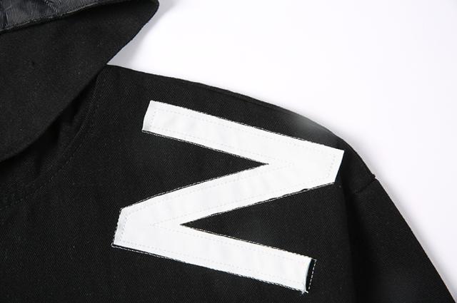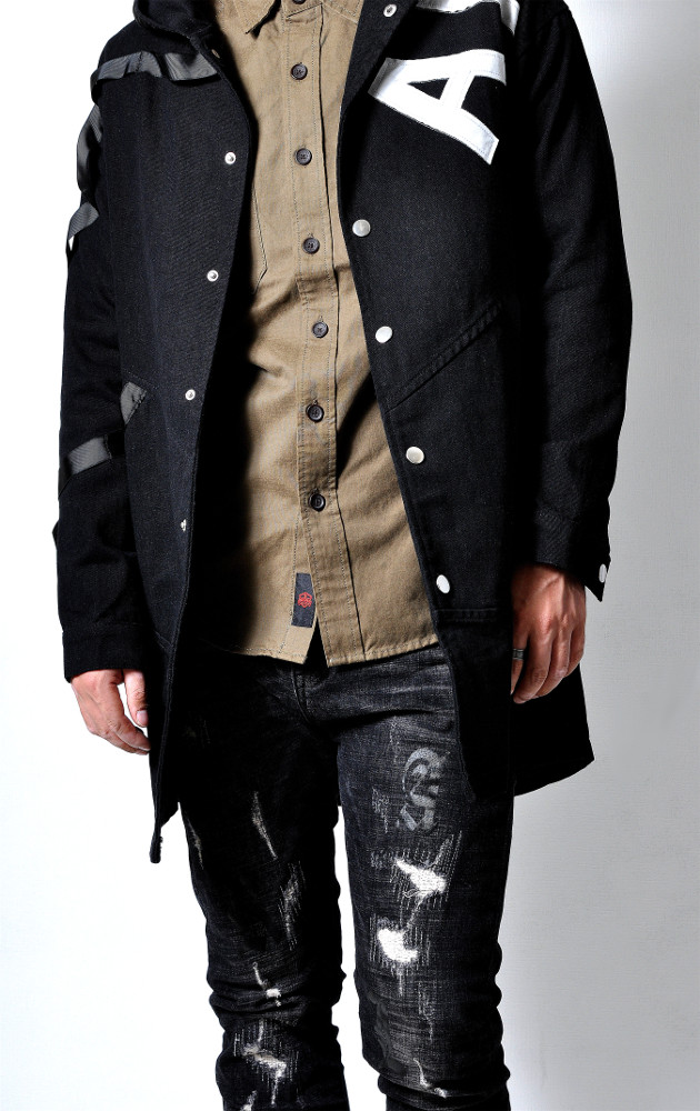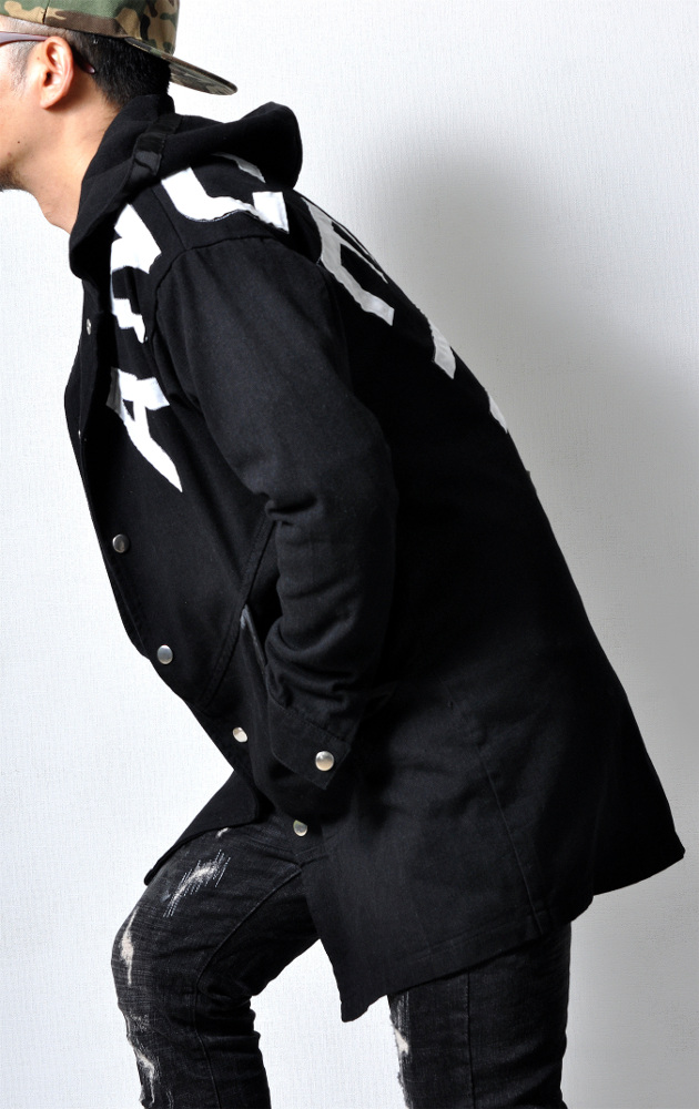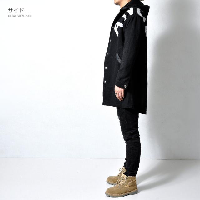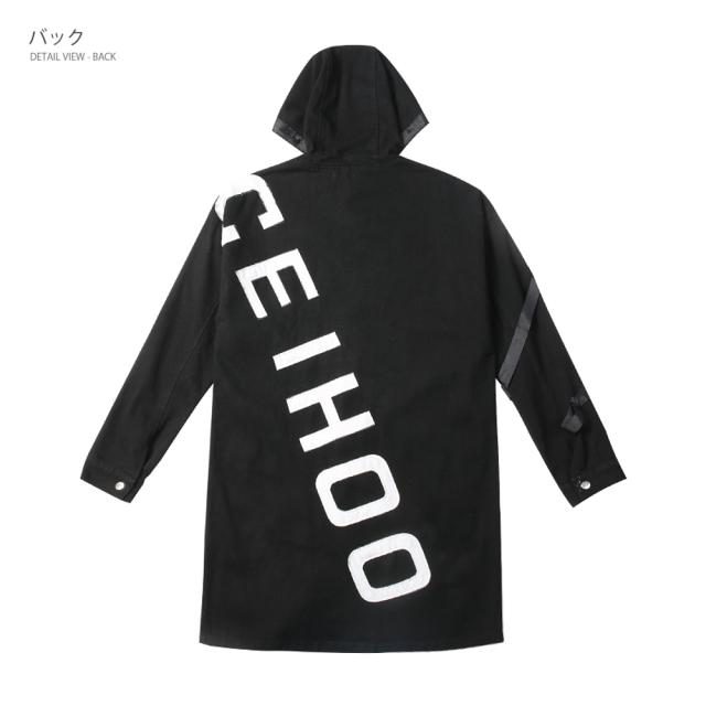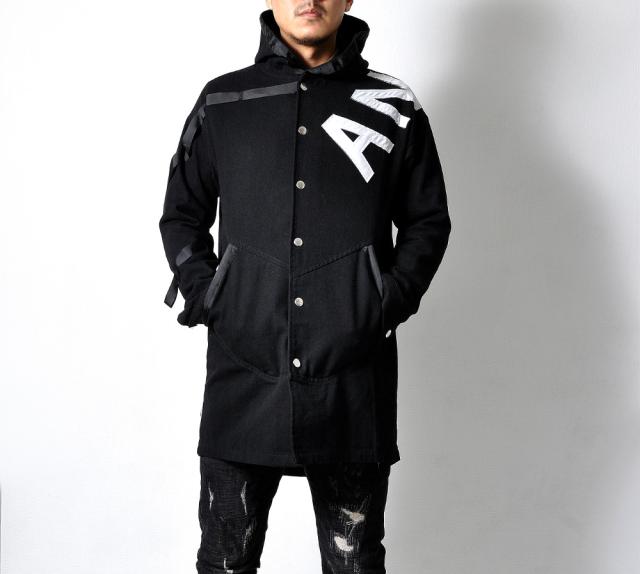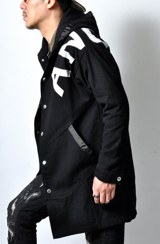 大胆に大きなロゴをアップリケした フード付きフィールドコート