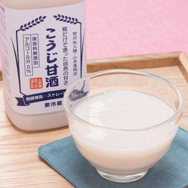 【余計なものは一切加えず糀の自然な甘さを味わえる発酵食品です。】信州八ヶ岳山麓水源地のきれいな水と長野県産米100%のこうじだけを使い、優良なこうじから醸し出された自然の甘さ(すっきり飲め飽きない味)が特徴です。保存料・糖類無添加、アルコール分0%のストレートタイプの甘酒です(要冷蔵)。お米の丸粒を砕いておりますのでこうじの粒が気になりません。こうじ甘酒は「飲む点滴」と言われるほど栄養価が高く、発酵の力によって天然の糖(ブドウ糖・オリゴ糖など)、必須アミノ酸、一般アミノ酸、天然吸収ビタミン群、こうじ酸などを豊富に含んでます。また牛乳・豆乳・ヨーグルト・コーヒー・緑茶・ブルーベリー等と割って飲んだり、料理に甘味料(砂糖・蜂蜜・みりん)の代わりに使うこともできます。当店は約200年前から細々と続けてきた糀屋ですが糀の品質には常にこだわりを持って優良な製品造りを心がけています。信州の高冷地で生まれたこうじ甘酒をどうぞお楽しみいただきたいと思います。