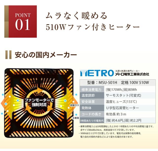 | メトロ電気工業製 石英管ヒーター(510W) 品番:MSU-501H 電源:交流100V 50-60Hz ヒーター:U字形石英管ヒーター コード長さ:3m 1時間あたりの標準消費電力 ■強:約170Wh/■弱:約80Wh 1時間あたりの電気代 ■強:約4.6円/■弱:約2.2円 (※新電力料金目安単価 1kWh あたり 27 円(税込)で計算しています。 実際の電気代は、電力会社との契約内容などで゙変わります。) 【メーカー保証1年】 |