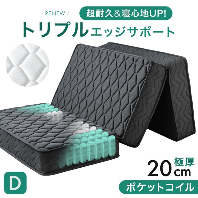 RENEW 寝心地UP 三つ折り マットレス ダブル 極厚20cm ポケットコイル トリプルエッジサポート 体圧分散 メッシュ 通気性 高反発 ウレタン ベッド マット スプリングマットレス 三つ折りマットレス 3つ折り 折りたたみ 折り畳み 圧縮