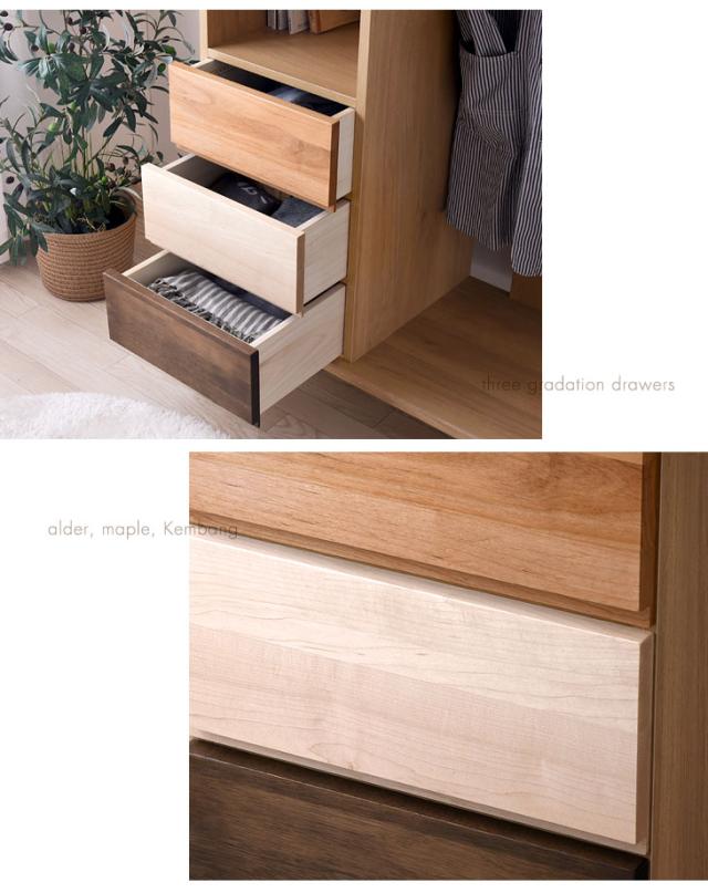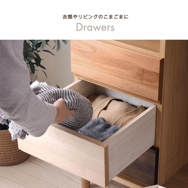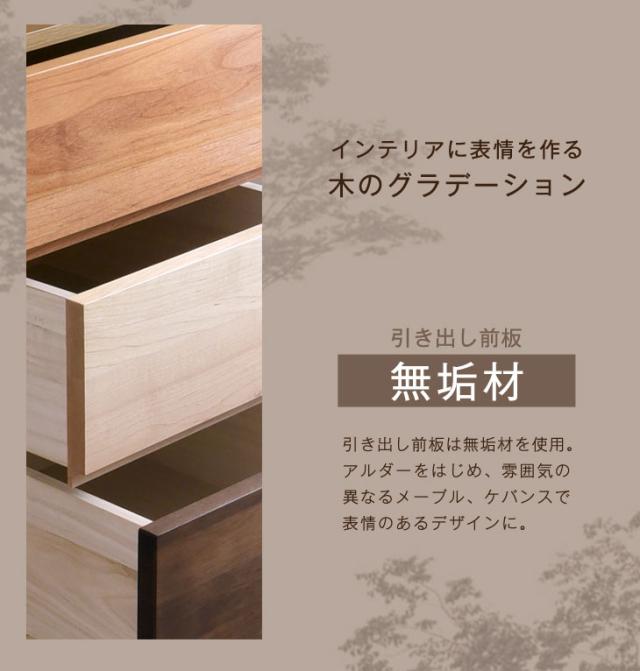 | 素材 | 引き出し前板のみ:無垢材(オーク、アルダー、メープル、ケバンス)、ウレタン塗装仕上げ 引き出し内側:桐 その他のパーツ:プリント化粧板 | |