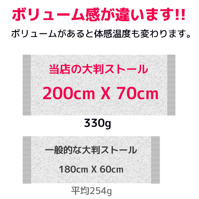 200cm×70cm ボリューム感ある大判サイズ、すき間なく包んでくれます。