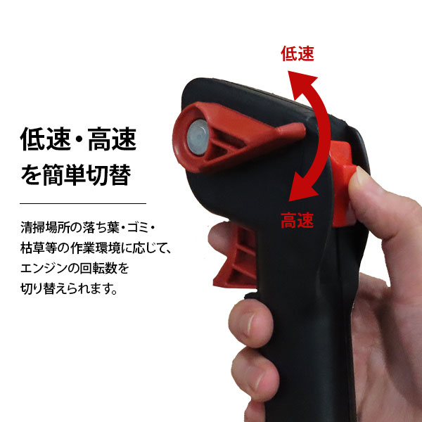清掃場所の落ち葉・ゴミ・枯草等の作業環境に応じて、エンジンの回転数を切り替えられます。
