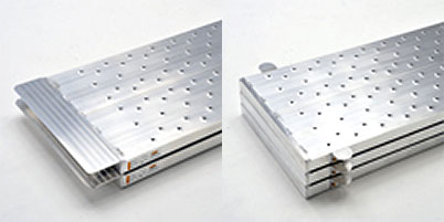 | 連結部分 連結はフックを引っ掛けるだけの簡単操作です。(連結足場板、タラップ) | 保管 積み重ねて保管できるので保管場所に困りません。 | |