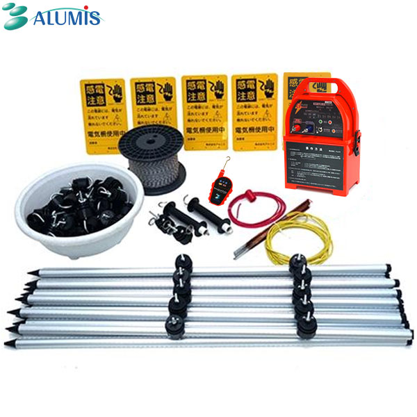 アルミス 電気柵 250m×2段張りセット FGN25-SETアルミスの防雨型250m電気柵セットです、屋外での使用可能です。周囲250m以内の田畑(家庭菜園など)に必要な部材が全て揃っていますまた、昼夜連続モード・昼のみモード・夜のみモードの切替えが可能で、光センサーが明るさを感知し昼と夜の判断を行います。