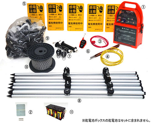 1 ファームガード・ノーマル本体×1 2 本体取付け金具(ネジ2本付)×1セット 3 出力コード×1本 4 アース棒(2連式)×1個 5 危険表示板×5枚 6 テスター×1個 7 ゲートグリップとゲートガイシ×2セット 8 アルミ支柱(20Φ×900mm)×75本 9 ファームガイシ(20Φ〜26Φタイプ)×150個 10 ファームコード(ヨリ線/500m巻)×1巻 11 乾電池ボックス(単1乾電池8個使用・電池別売)×1個 12 取扱説明書(保証書付)×1部