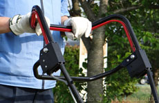 デットマンスイッチを握るとエンジンがON、離すとOFFに。万が一のとき、手を離すとエンジンが停止し、刃の回転も止まります。