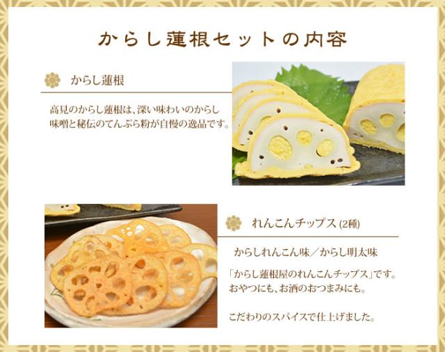- 辛子蓮根が食べたいな〜と商品検索中に子供から「チップスが食べたい!」とリクエストされたので、予算内で両方入ってるセットがあって助かりました。美味しかったらまた買います。