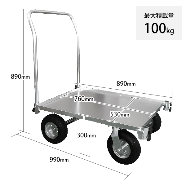 最大積載荷量 100kg 積載面サイズ W530×L760mm ハンドル高さ 890mm 荷台高さ 300mm 自 重 約14kg 車輪径 8インチ