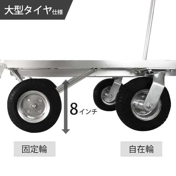 8インチの大型タイヤ仕様(自在輪×2、固定輪×2)。多少の段差や不整地でもお使い頂けます。