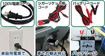 | 活魚の中距離輸送が可能! シガーソケットに直接繋げるので、エアーパックを運転させながらの中距離輸送ができます。 ※写真はエアパック20を使用しています。 | 各種電源コード付属 シガーソケット・12Vバッテリー・100V電源兼用で状況に応じて電源コードを使用することができます。 |