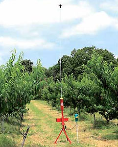 | プロパン爆発によるエネルギーをおどし羽根の打ち上げに使い、爆発音を最小限に抑えました。 おどし羽根は4.5mの高さから銃で射撃されたような状態で落下しますので、他の鳥などが恐れて近ずきません。 お悩みの棚・傾斜のある果樹園(ブドウ・ナシ・リンゴ等)に! 移動が簡単に行える鳥害対策爆音器です。 | ![]() 設置例 |