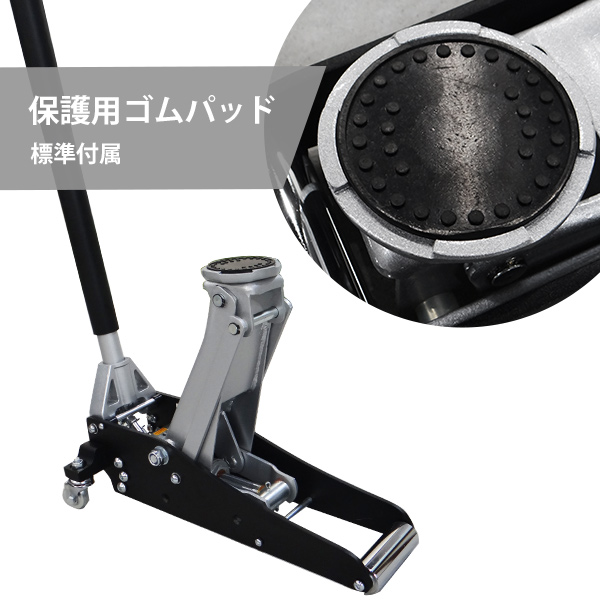 アルミ+スチール製でサビに強く、高耐久なデュアルポンプ型の油圧ジャッキです。通常のガレージジャッキとして整備やメンテナンスでのご使用はもちろん、サーキットや出張作業での持ち出し用ジャッキとしても活躍します。サドルに保護用ゴムパッドが標準装備しているため、車を傷つけずすべりによる事故も防ぎます。またハンドル部の保護スポンジで大事な車両にキズが付きません。特長