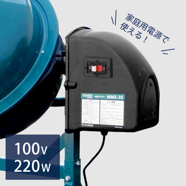 ミナト 電動コンクリートミキサー 1.25切 MMX-30 (100Vモーター・車輪付) コンクリート・モルタルの混練や園芸用の堆肥・肥料の混練用途にも最適な、家庭用100Vの小型コンクリートミキサーです。小型軽量のため場所を取らずスムーズに移動できます。1回練り上げ量が30L、ちょっとした電気水道工事・エクステリアなどの補修工事や園芸の混練にご使用ください。■作業後は水洗いしてください。そのまま放置すると、タンク内にコンクリートが固着して使用できなくなる場合があります。商品は運転中減速機モーター部分の騒音が若干致しますのでご了承お願いします。