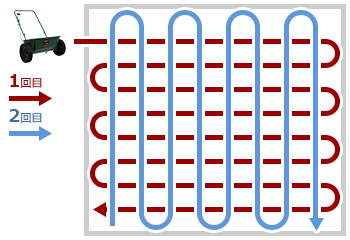 1回の散布量を少なめにして、縦方向・横方向など複数回に分けて散布する事で均一に散布できます。