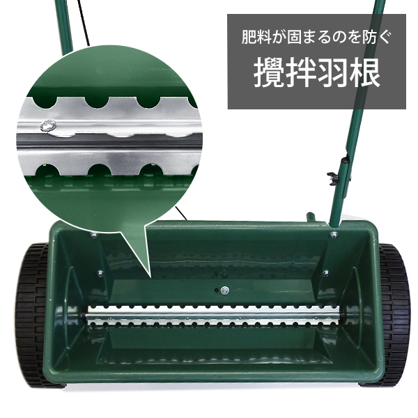 ホッパーの底に攪拌羽根が付いているため、肥料が固まらずより均一に散布できます。