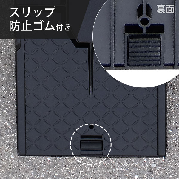 先端にゴムが付いているため、乗り上げると圧が掛かり、地面とタイヤの間にしっかり食い込んでスロープの吹き飛びを防止します。