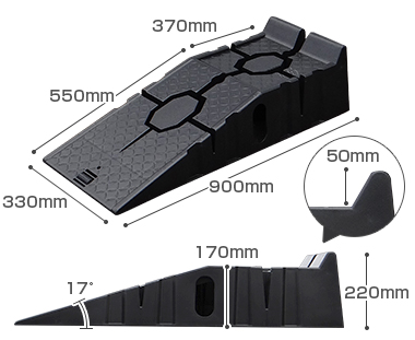 スロープ幅が広いためタイヤを乗り上げやすいカースロープです。ジャッキよりも素早く簡単に車両を170mm上げられるため、タイヤ・オイル交換や足回りの整備に活躍します。耐久性が高い一体型。分割タイプに比べ組立の必要が無く、重ねて省スペースで保管できます。滑り防止の溝や吹き飛び防止のゴムが備わっており、安定した乗り上げができます。また、軽量タイプのため大型でも持ち運びやすいです。