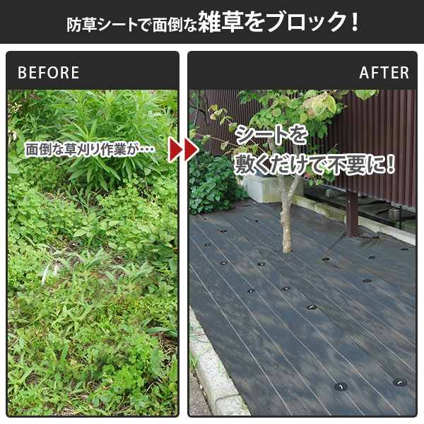 手間のかかる草取り作業が防草シートを敷くだけで、簡単に日光を遮り雑草を防止します。