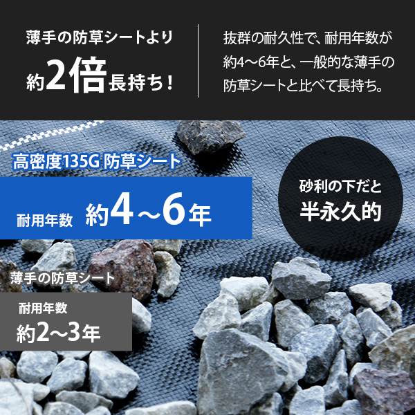 耐用年数が4〜6年と長く、薄手の防草シートと比べて約2倍長持ちします。